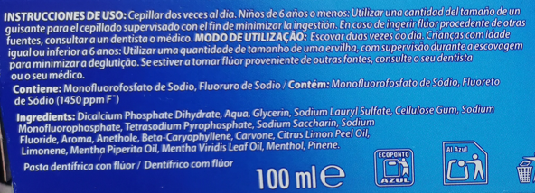 Comentario profesional: buena pasta básica para prevención de caries en uso diario; adecuada si buscas una fórmula sencilla sin SLS.