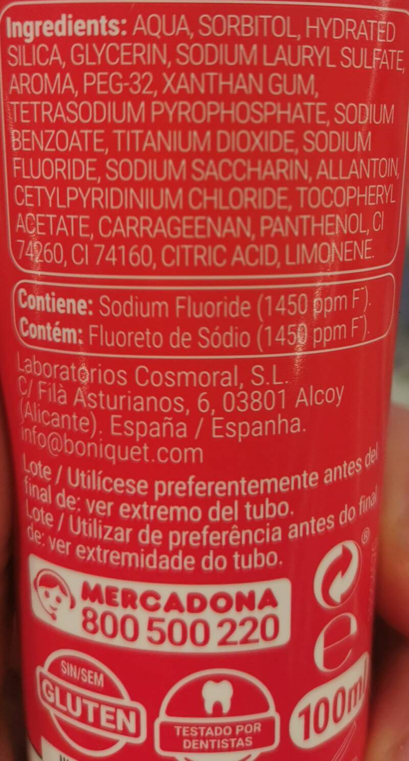 Flúor: 1.450 ppm (fluoruro de estaño + fluoruro de sodio)