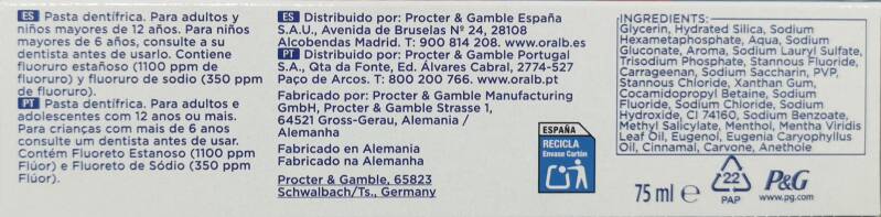 Flúor: 1.450 ppm (1100 ppm fluoruro estañoso + 350 ppm fluoruro de sodio)