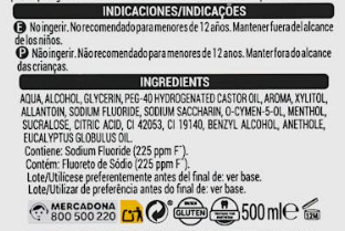 Aqua, Sorbitol, Alcohol, Poloxamer 407, Benzoic Acid, Sodium Fluoride, Eucalyptol, Aroma, Zinc Chloride, Sodium Saccharin, Methyl Salicylate, Thymol, Menthol, Sucralose, Sodium Benzoate, CI 42090, CI 16035. Contiene fluoruro de sodio (450 ppm de flúor).