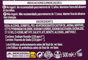Aqua, Alcohol, Sorbitol, Poloxamer 407, Benzoic Acid, Eucalyptol, Zinc Chloride, Methyl Salicylate, Thymol, Sodium Benzoate, Sodium Fluoride, Menthol, Sucralose, Aroma, Sodium Saccharin, CI 42090. Contiene fluoruro de sodio (220 ppm de flúor).